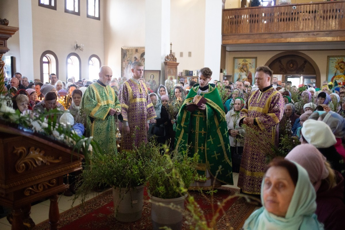 5 апреля 2026 года в великий двунадесятый праздник Входа Господня в Иерусалим; неделя цветоносная, вербное воскресенье; иерей Владислав Стасенко совершил Божественную литургию в соборе Казанской иконы Божией Матери города Калинковичи.