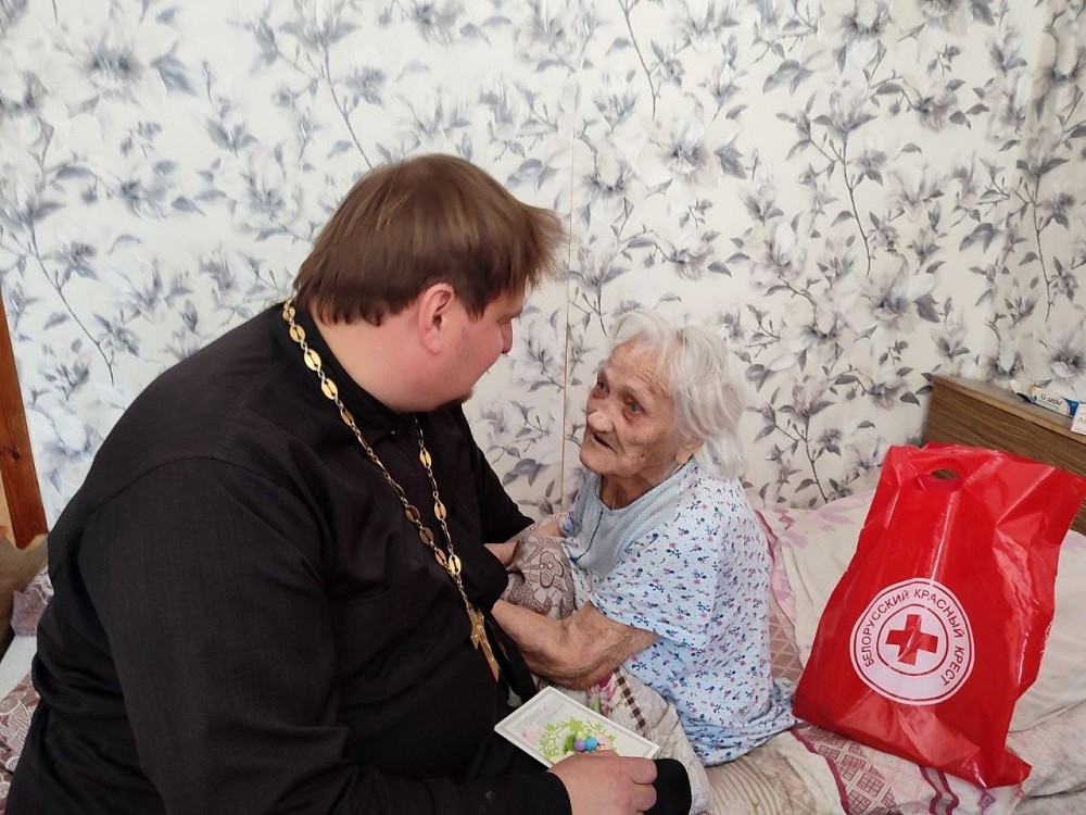 15 апреля 2026 года, в дни празднования Святой Пасхи, благочинный Калинковичского округа, настоятель храма святых благоверных Петра и Февронии Муромских в г. Калинковичи иерей Сергий Карпович совместно с председателем Калинковичской районной организации Белорусского Красного Креста Зинович Аллой Ефимовной поздравили с Пасхой Христовой подопечных на дому.